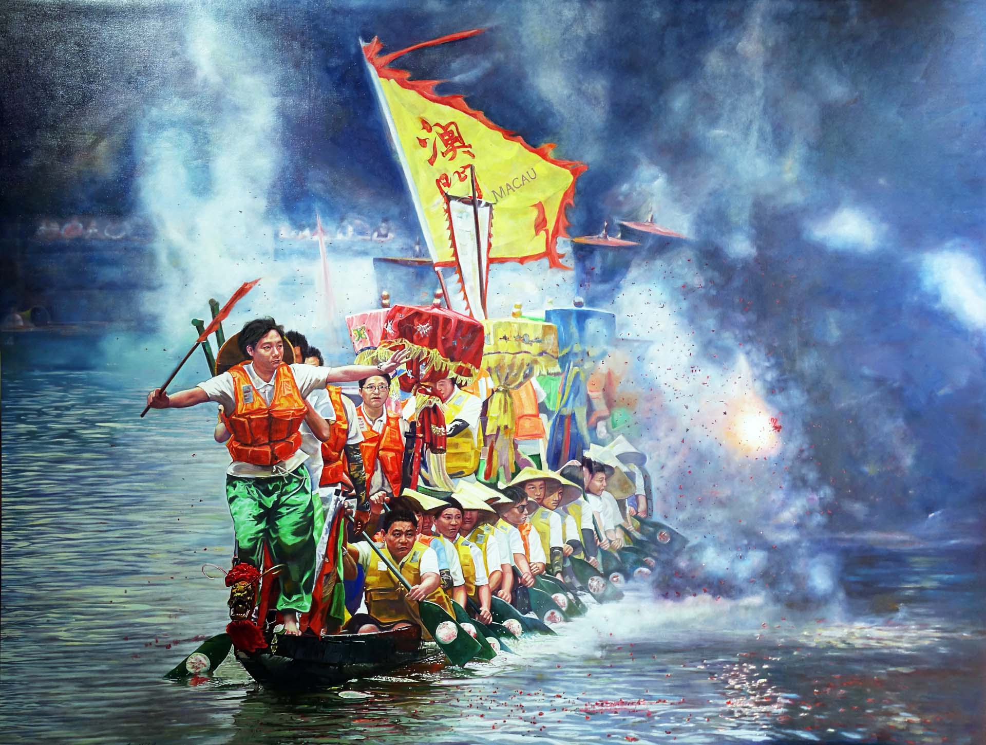 The painting seeks to capture the dynamism of Macao’s dragon boat races, blending the physical intensity of competition with motifs drawn from Chinese traditions. Prof. Gu explained that the work employs imagery, colour and form through a visual language intended to resonate with the public, evoking a sense of cultural belonging within the Guangdong-Hong Kong-Macao Greater Bay Area. For him, the project is more than an artwork; it reflects a broader cultural identity and Macao’s place within the national narrative.